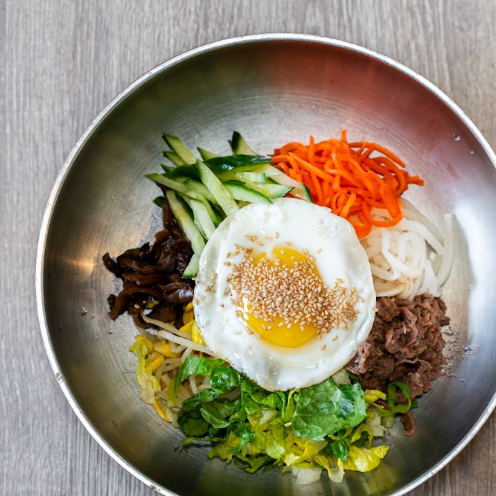 A hearty bowl of steamed rice topped with assorted vegetables, marinated beef, and a sunny-side-up egg, served with a side of spicy gochujang sauce.